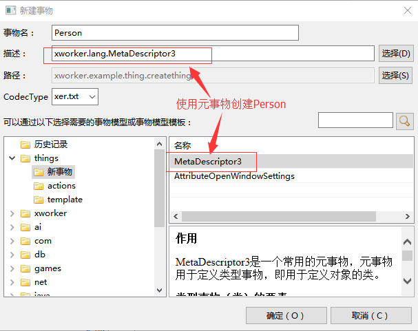 描述者相当于面向对象中的类,也相当于XML的结构,因此创建描述者就是创建类和结构,而元事物则是创建描述者的事物模型。