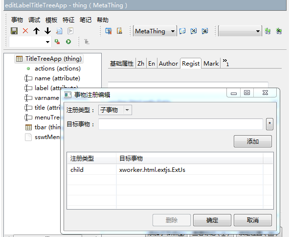 如图TitleTreeApp把自己注册到Extjs事物下,这样在编辑Extjs界面时就可以添加TitleTreeApp子节点了。