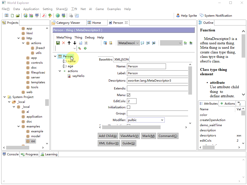对象是通过类创建出来的,类似于对象的实例化过程。在XWorker的模型编辑器里对象通是通过它的类(描述者)编辑出来的。