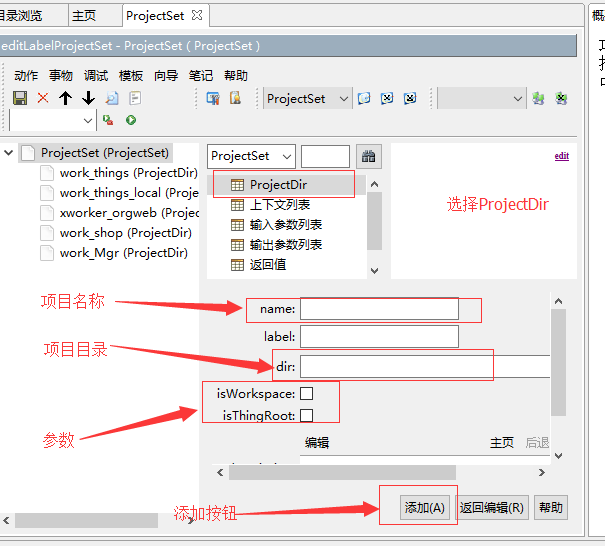 在ProjectSet编辑界面点击添加子节点(A)按钮,进入添加子节点的界面。